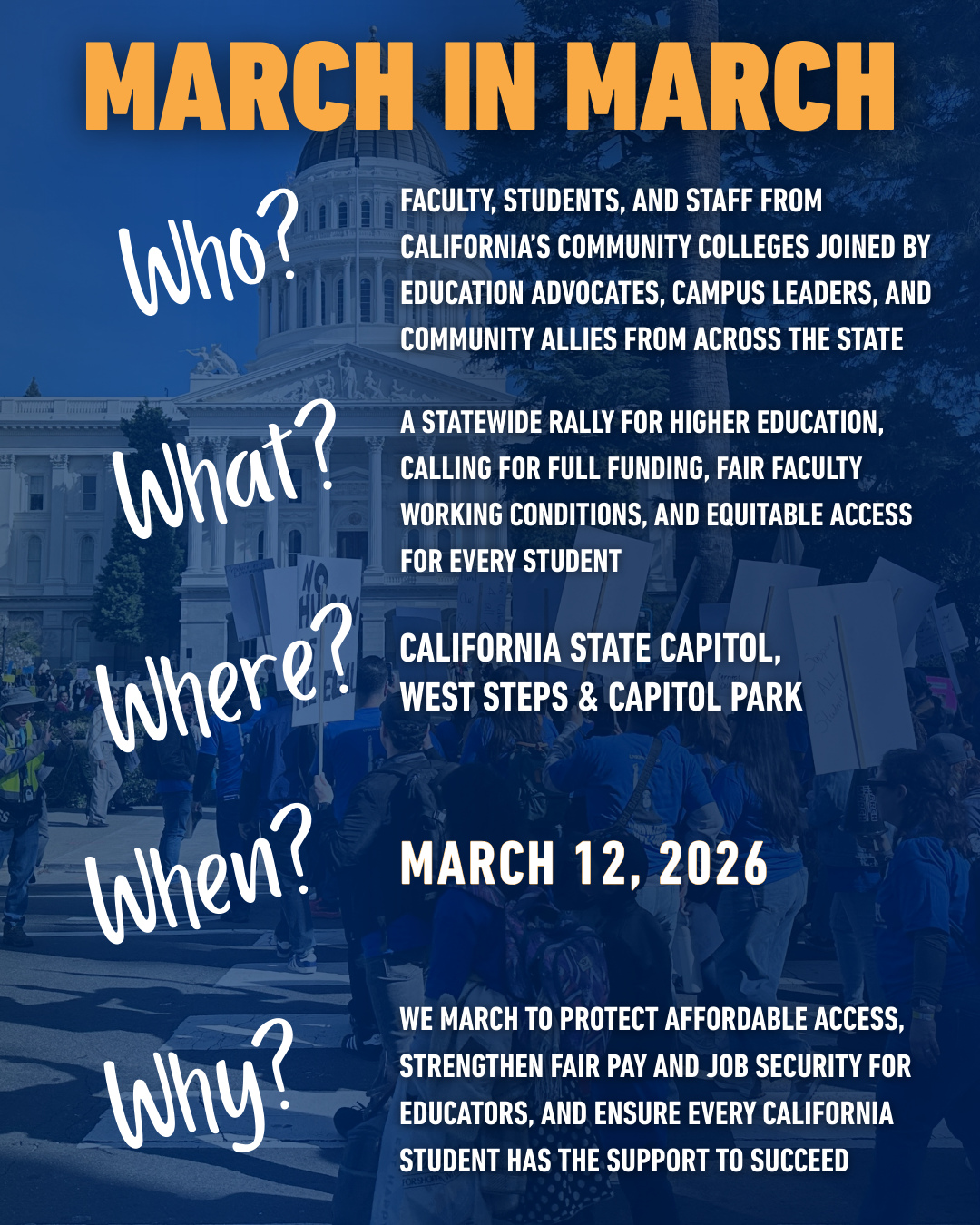 Save the Date: March in March for Students' Futures – March 12, 2026! Mark your calendars and be part of the movement! Join us on Thursday, March 12 for the March in March as we rally for students' futures. Why do we march?